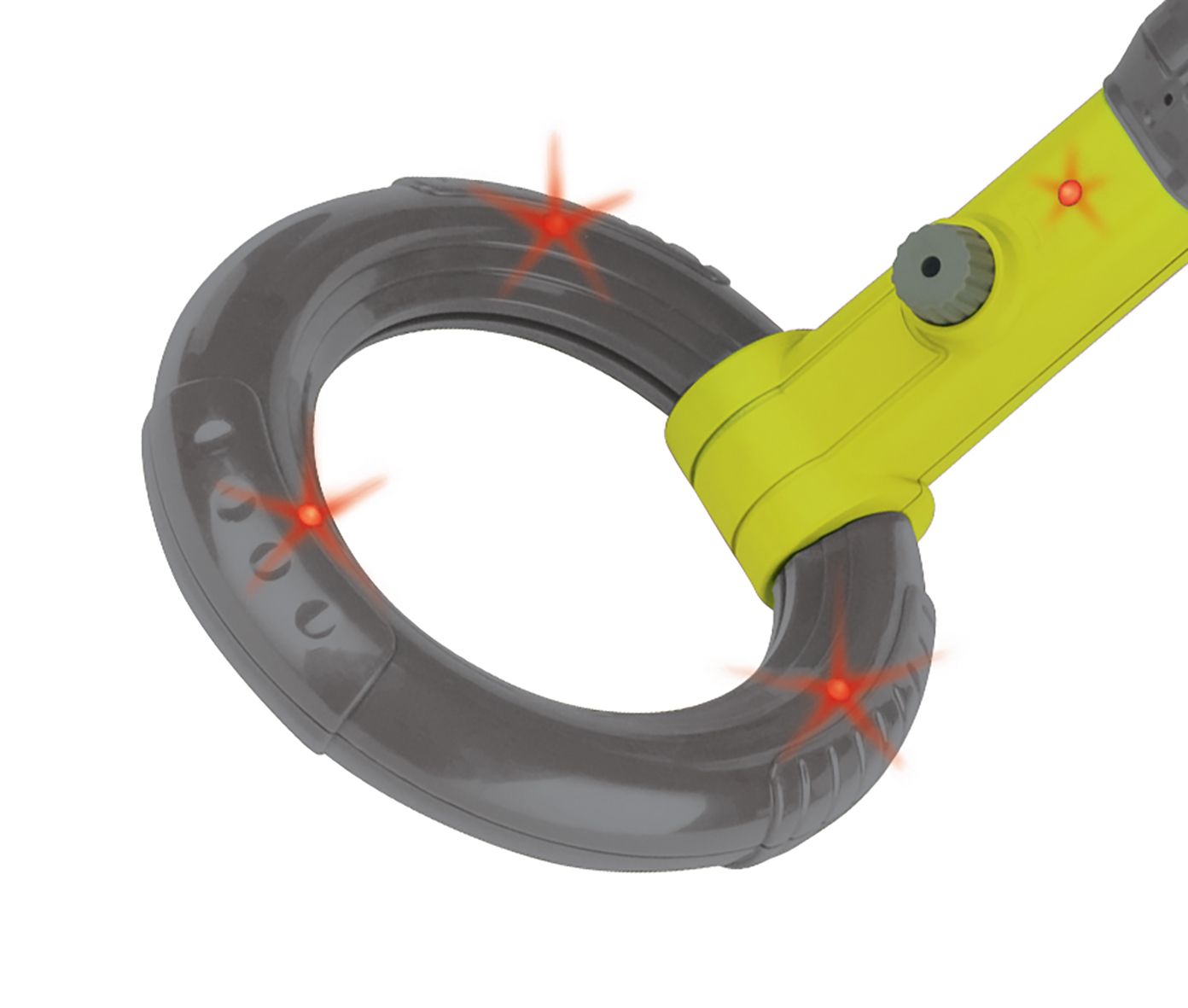 Münzen und andere metallische Gegenstände lassen sich einfach mit dem Metalldetektor vom ADAC aufspüren. Er besteht aus drei Teilen und lässt sich sowohl als Handgerät als auch als Stabgerät nutzen. Mit einer Länge von ca. 74 cm kann der der kleine Entdecker ganz bequem den Boden absuchen.
