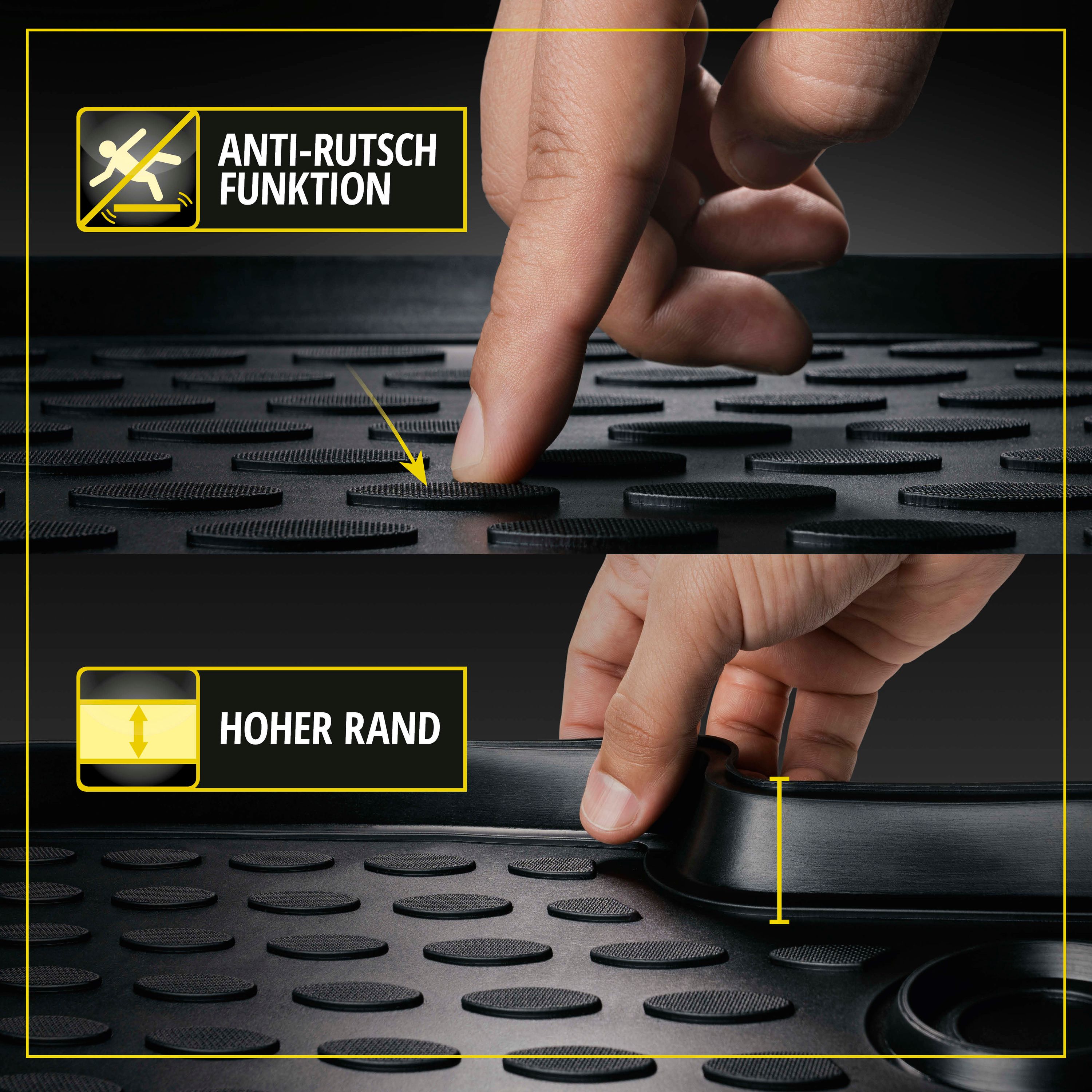 • Praktisch: Dank hohem Rand bieten die passgenauen Gummimatten optimalen Schutz vor Schmutz, Nässe, Schnee, Split, Salz uvm.